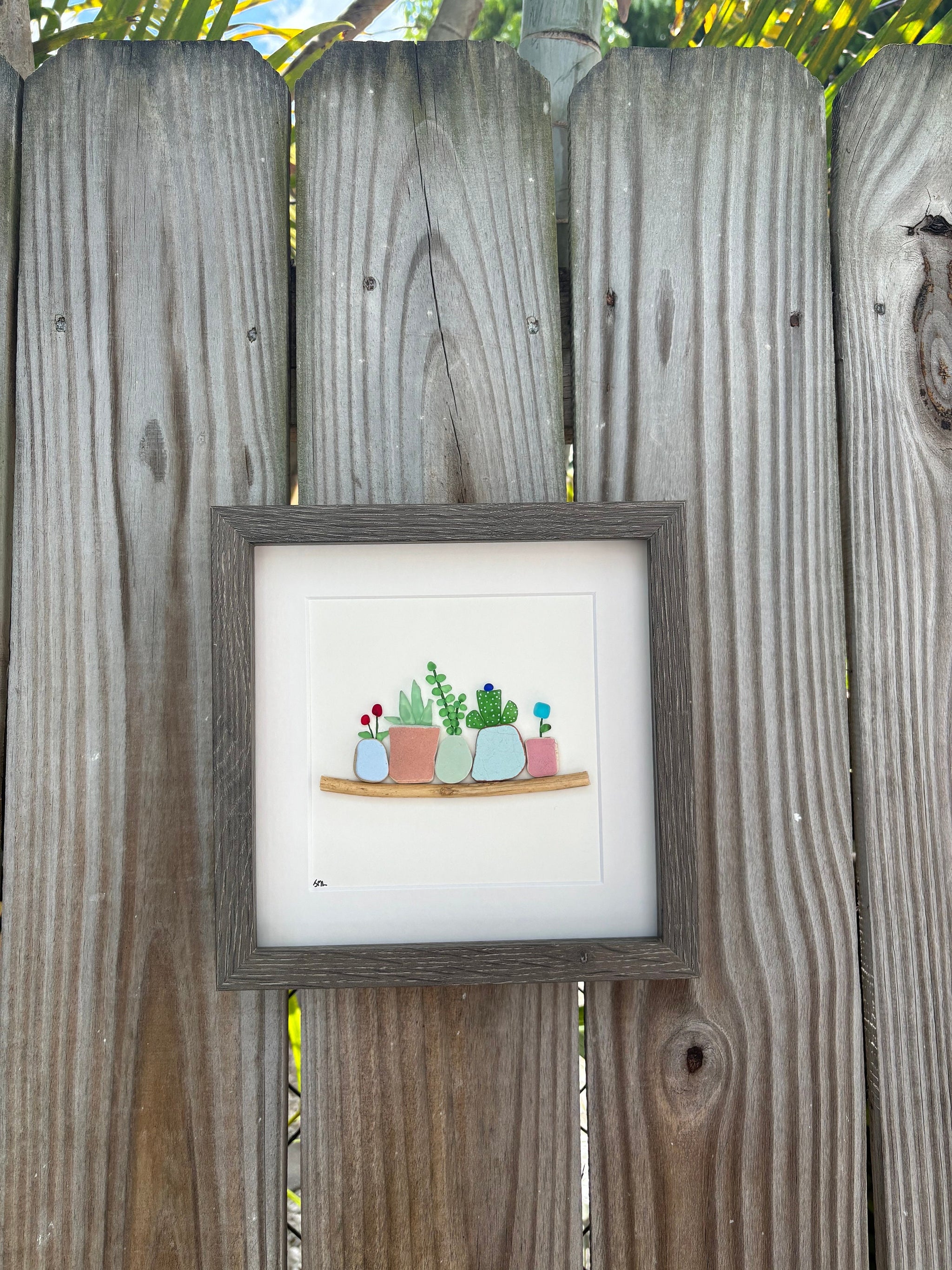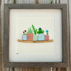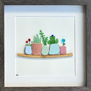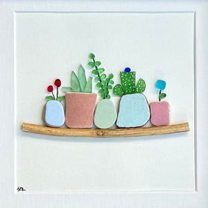 Beautiful handmade artwork featuring a group of pastel beach pottery plant pots filled with beautiful sea glass plants and flowers. Perfect gift for anyone that loves plants, gardening or the beach!