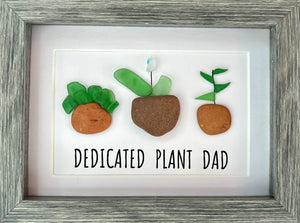 Framed plant dad art featuring three pot plants made from pebbles and sea glass found on the beaches of Scotland. Perfect gift for anyone that loves to fill their house with plants and flowers.