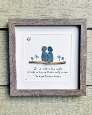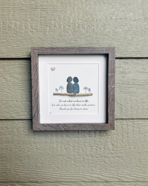 A heartfelt pebble art piece featuring natural stones, sea glass flowers, and driftwood—paired with a touching quote about gratitude and love.