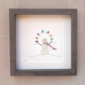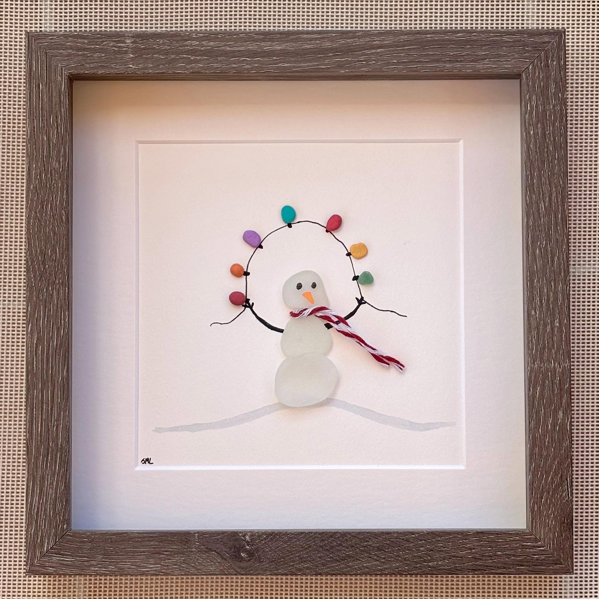 The picture features a sea glass snowman juggling holiday lights. A one of a kind piece of artwork!