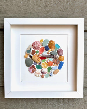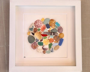 Circle of beach treasures in amazing natural colors that show off the beauty of our beaches and ocean. This picture is made from a hand picked selection of shells, sea pottery, sea glass, and colorful pebbles found mostly on Scottish beaches and carefully arranged in a shadow box frame. Perfect gift for anyone that loves the beach / seaglass / coastal decor.