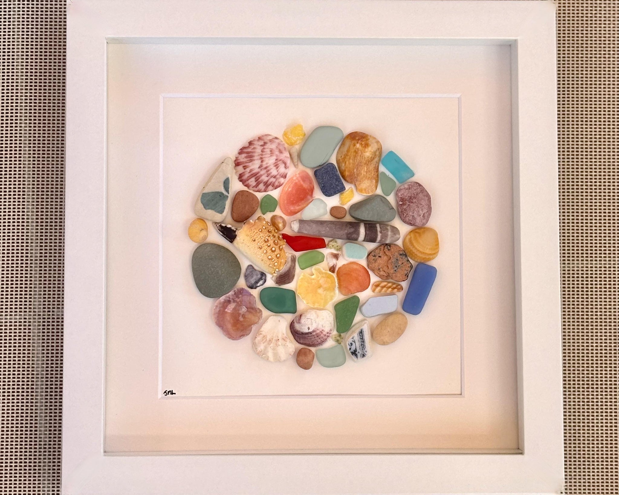 Materials: Pebbles, Scottish Sea Glass, Driftwood, Sea Pottery, Shells, Premium Picture Mat, Shadow Box Frame.