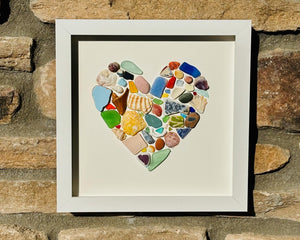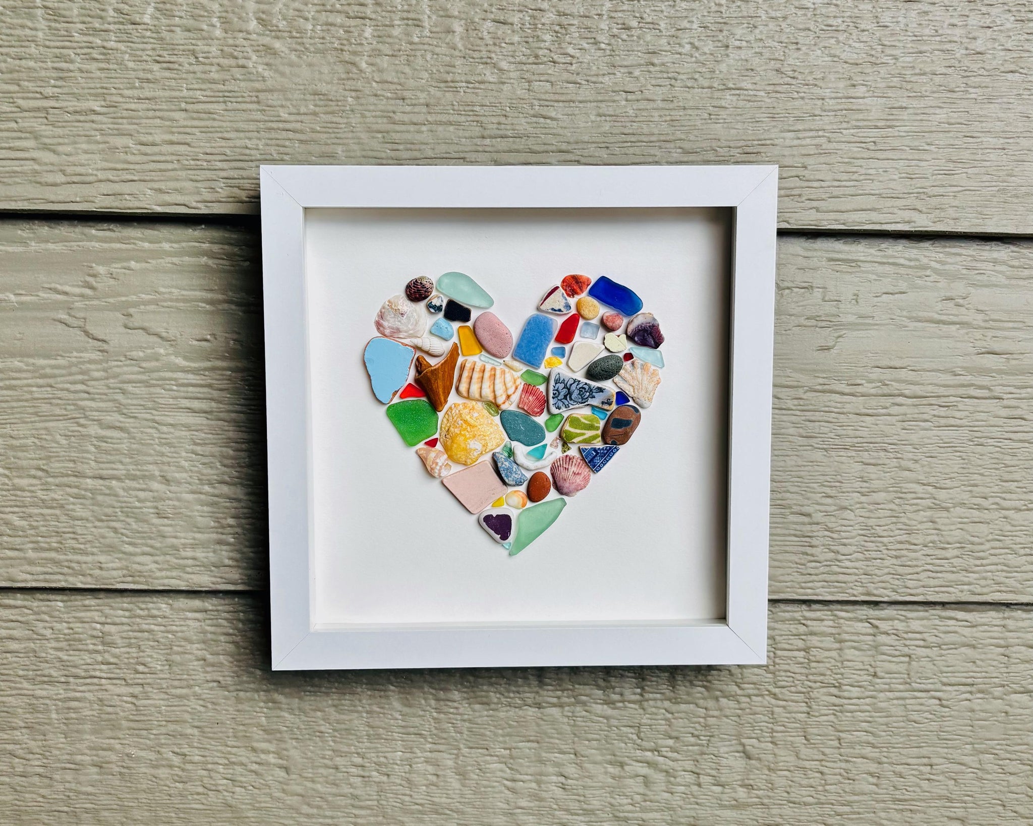 A vibrant mosaic heart crafted from colorful sea glass, pottery, and shells—perfect for coastal décor, anniversaries, or a heartfelt gift.