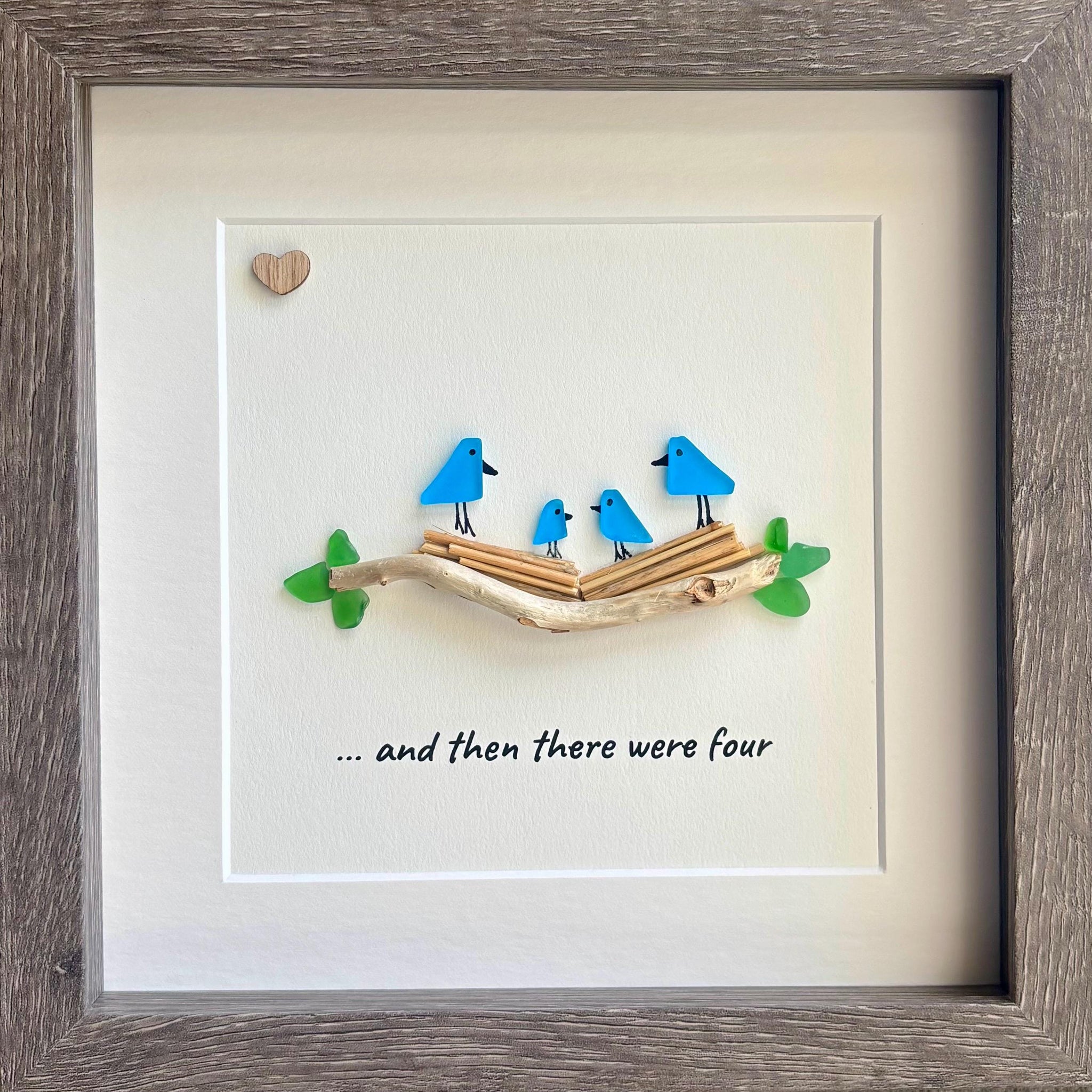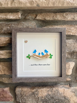 Sea glass bird family featuring two parents and their two children in a nest with the caption "...and then there were four". Perfect gift for baby shower, mom of 2 kids, new parents, Mother’s Day or Father's Day.
