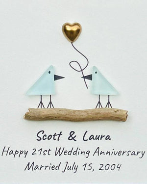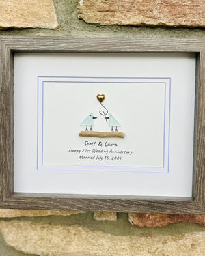 Beautiful 21 year "nickel" or "brass" wedding anniversary gift made from sea glass and driftwood. Artwork is personalizable with names and date of marriage. Includes a nickel / brass heart and sea glass birds to represent one of the more modern takes on the 21st anniversary present.