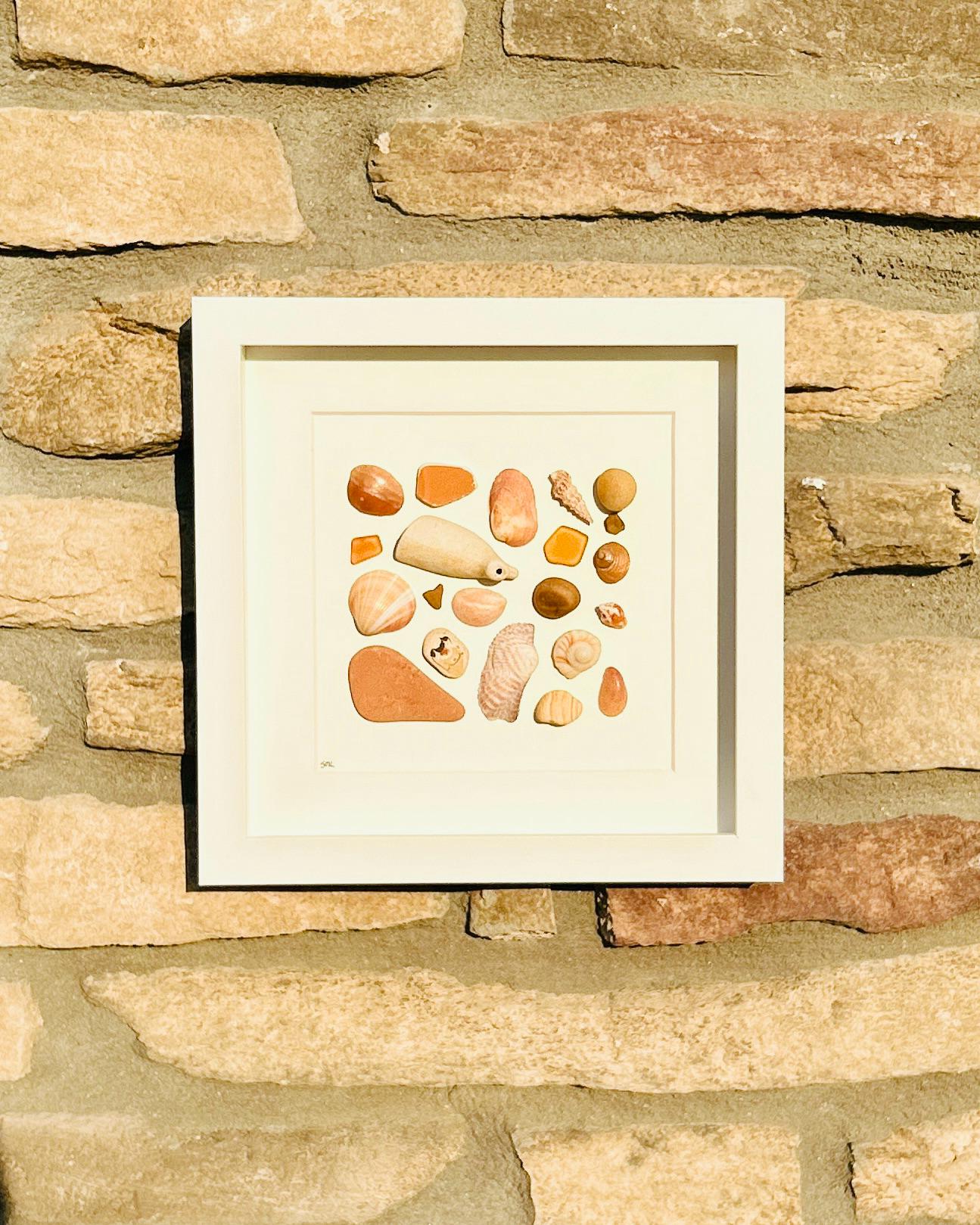 Shells and sea treasures in delicate shades of orange and yellow arranged into a square beach collage made up of colored sea pottery, shells, sea glass and pebbles.