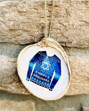 Celebrate the Festival of Lights with this charming Hanukkah sweater ornament, handcrafted using a decoupage technique on a sea shell with gold-leaf edging. Featuring a festive blue sweater with menorah and Star of David details, it’s the perfect addition to your holiday décor or a thoughtful seasonal gift. Each piece is handmade with care and ready to hang.
