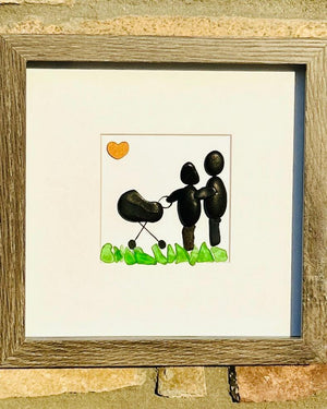 Celebrate the beautiful journey of parenthood with this handcrafted pebble art featuring two parents lovingly strolling with their baby in a pram. Made from naturally collected pebbles, sea glass, and driftwood, this heartfelt piece captures the magic of family life and makes a perfect gift for new parents, baby showers, Mother’s Day, Father’s Day, or nursery décor.