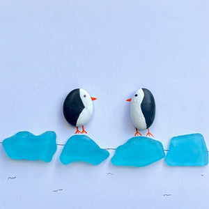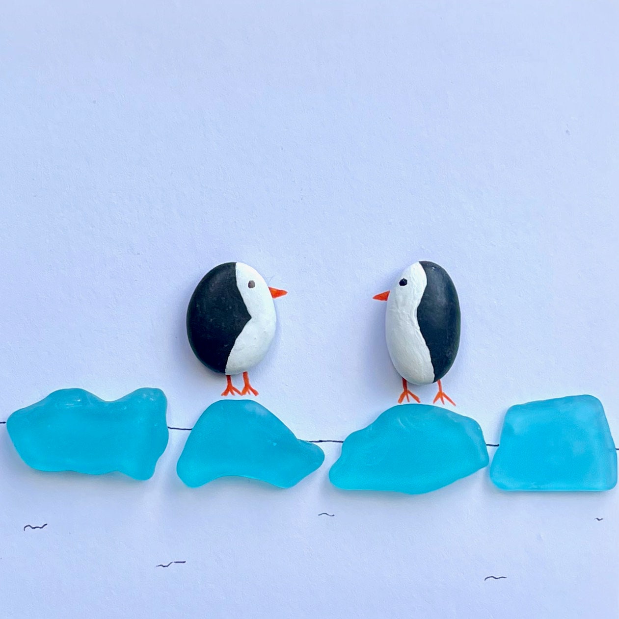 Beautiful handmade pebble and sea glass art featuring two penguins enjoying life on the ice. Perfect artwork for anyone that loves penguins. This picture measures 8x8 unframed and includes a gray shadow box frame.