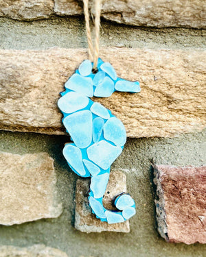 Bring a touch of the ocean to your home with this handcrafted seahorse ornament made from naturally tumbled blue sea glass. Each delicate piece of glass is carefully arranged to form the graceful shape of a seahorse — a timeless symbol of patience, calm, and strength.