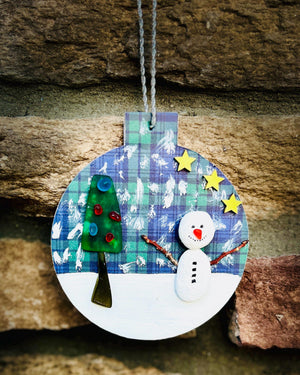 Bring the magic of the season to your home with this handcrafted Christmas ornament featuring a cheerful snowman and a festive tree made from sea glass and pebbles. Set against a cozy green tartan background with hand-painted snow and golden stars, this piece captures the warmth and whimsy of a winter wonderland.