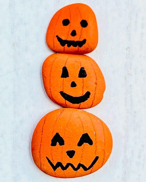 Celebrate the spooky season with this handcrafted Halloween ornament featuring three cheerful jack-o’-lanterns made from hand-painted pebbles. Each tiny pumpkin face is unique, bringing a touch of whimsy and warmth to your fall décor. Mounted on a whitewashed wooden tag and finished with natural jute twine, it’s the perfect accent for your entryway, mantle, or Halloween tree.