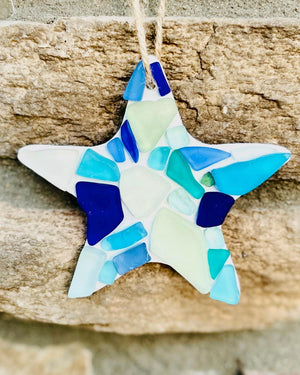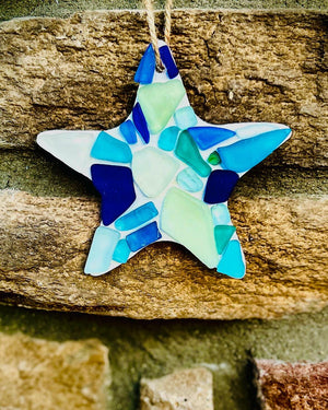 Bring a touch of coastal serenity to your home with this handcrafted starfish ornament made from genuine sea glass in soothing shades of blue, aqua, and seafoam. Each glass piece is carefully selected and arranged to capture the natural beauty of the ocean — glistening like sunlight on the waves.